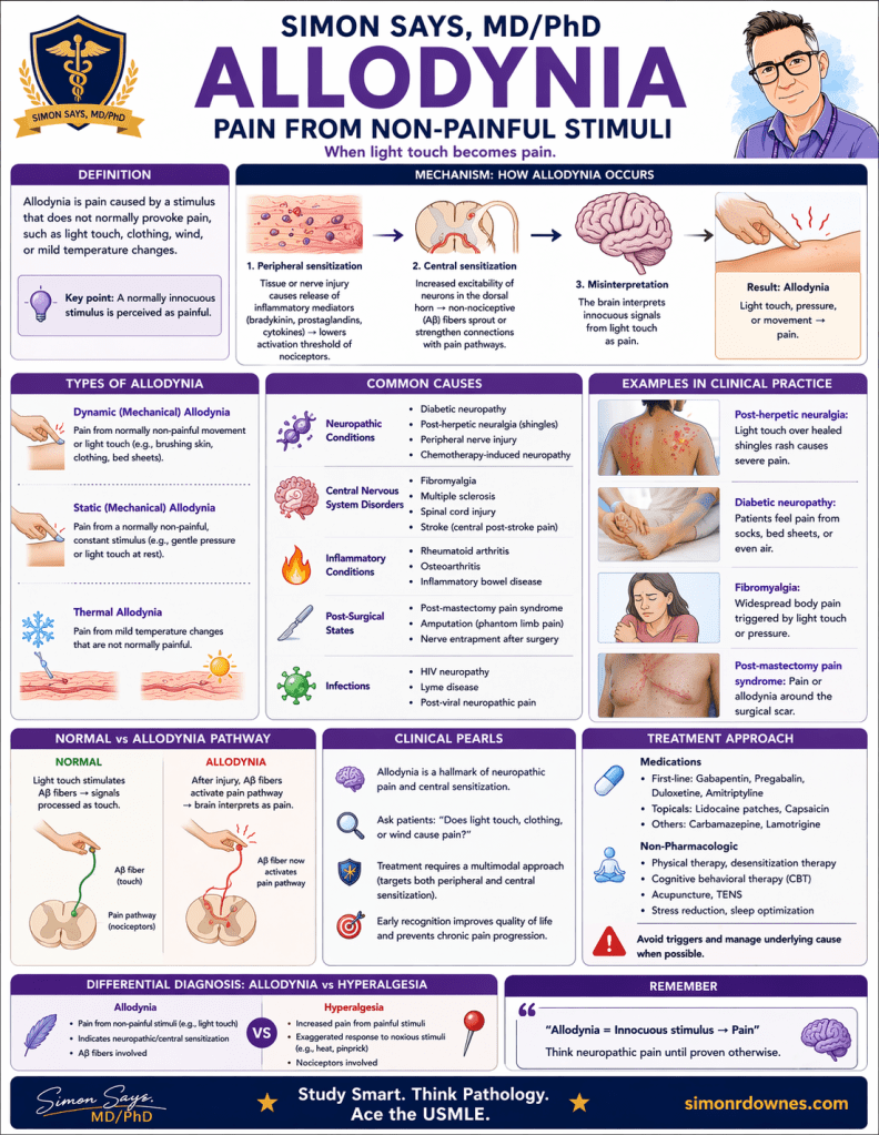 Allodynia – Allodynia is a symptom of central sensitization or nerve damage where non-painful stimuli—such as light touch, brushing hair, or mild temperature changes—cause pain. Often linked to conditions like migraines, fibromyalgia, or postherpetic neuralgia, it typically results from altered pain processing in the nervous system. Treatment focuses on managing underlying conditions and using specialized nerve pain medications.